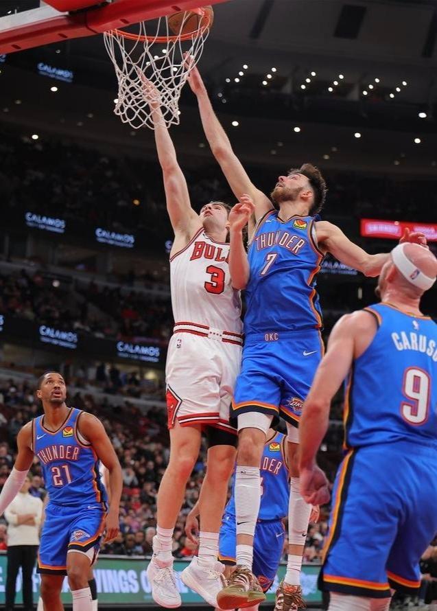 比赛伊始,双方并没有过多的试探,迅速进入了高强度的对抗节奏。公牛队的首发控卫塞克斯顿成为了主队进攻端的箭头人物,他利用自己的速度优势频频冲击雷霆的内线,整场比赛下来,他交出了20分1篮板2助攻的成绩单。塞克斯顿的得分爆发力让公牛队在进攻端保持着竞争力,但他单一的终结方式在雷霆严密的防守体系下,逐渐显得独木难支。与之相呼应的是公牛内线亚布塞莱的出色发挥,这位在内线苦苦支撑的大个子全场贡献了18分12篮板的两双数据,外加1抢断1盖帽。亚布塞莱在攻防两端的强硬表现,是公牛队能够在大部分时间内咬住比分的关键所在。