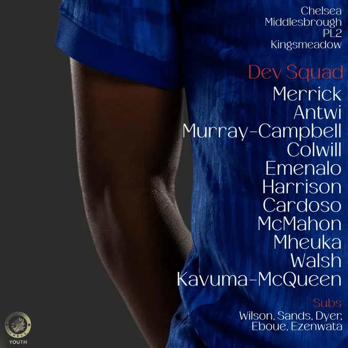 虎扑04月25日讯 切尔西青训梯队官方宣布了今晚对阵米德尔斯堡的PL2季后赛大名单。